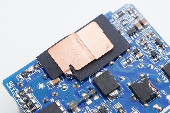 拆掉散热片,变压器上贴有蓝色导热垫提升散热效果,元器件之间打胶进行加固,初次级间也做了隔离绝缘。