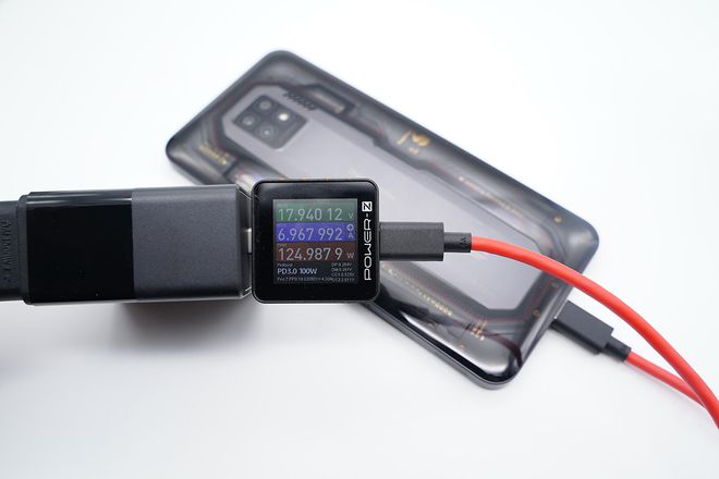 最后使用随机附送的165W快充套装给红魔7 Pro充电,测得功率为17.94V 6.97A 125W。
