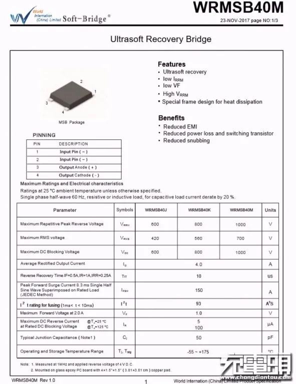 经过EMI电路过滤后,由沃尔德两颗WRMSB40M整流桥将交流电转换为脉动直流电。这颗软桥通过较软的恢复曲线,比较平滑的关断特性,可以降低二极管结电容达到非常少的谐波振荡产生的效果。